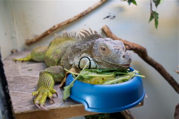 Idag är Katla en mycket trött leguan. Så trött att hon inte ens orkar äta, utan somnade med huvudet i maten istället. På bilden hade hon vaknat till lite, jag missade tyvärr att fota henne när hon sov.