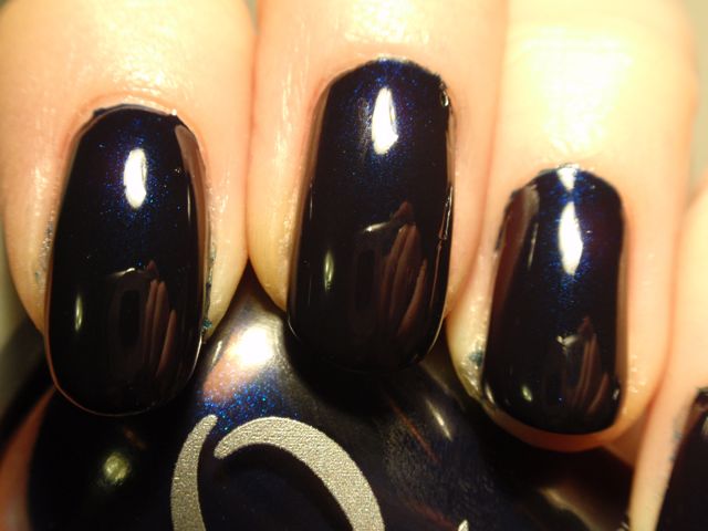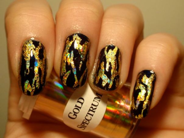 Jag har fått hem en hel bunt nya, fina nagelfolier från No1 Nail Art Shop på eBay, så det blir nog en del folie framöver. När jag skickade efter den här insåg jag inte hur fin den faktiskt var, men den är riktigt läcker. Jag tänkte variera mig och inte kombinera guld med svart för en gångs skull (det känns liksom ofta självklart), men jag lyckades inte helt och hållet med det. Orly Star of Bombay är visserligen mörkt, mörkt blå, men det ser svart ut nästan jämt. Jag köpte det här innan jag började blogga, så jag har inte visat det tidigare, så ni får en närbild för att demonstrera att det finns ett diskret blått skimmer i det: