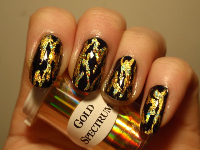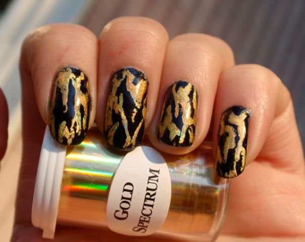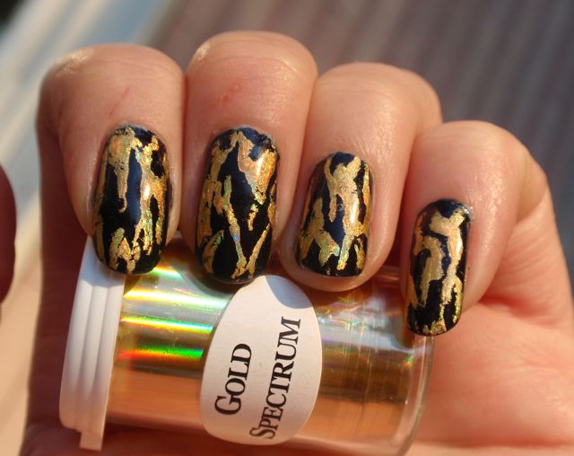 I have gotten a bunch of nice new nail art foils from No1 Nail Art Shop on eBay. This one, Gold Plated, was actually nicer than I expected. It is a very pretty gold holo and it was very nice to work with. I tend to always combine gold with black, so I combined it with what I thought would be a dark blue polish, Orly Star of Bombay. In reality it looks black in most lights, so my plan to get some variation failed. The formula of Star of Bombay was really nice, it was easy to control and two coats was enough. I have now worn it for three days and it still looks good.