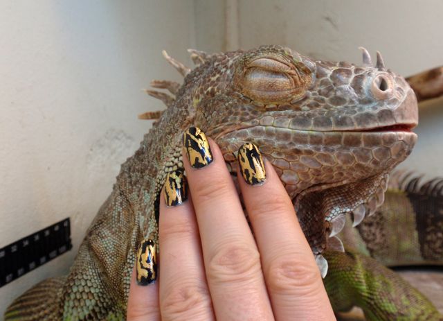 I painted an irregular pattern with the foil glue to get an almost crackled look. It was tricky to catch the holo in the foil with my camera, so I tried a few different lighting conditions, for example under the UV-lamp in the terrarium. It was not ideal to bring out the holo, but Katla was so cute, so I posted one of the pictures and a video anyway…