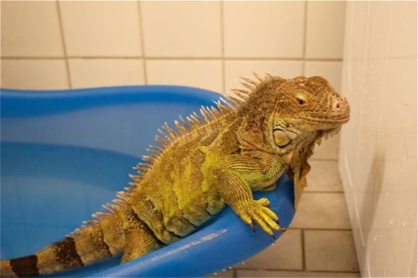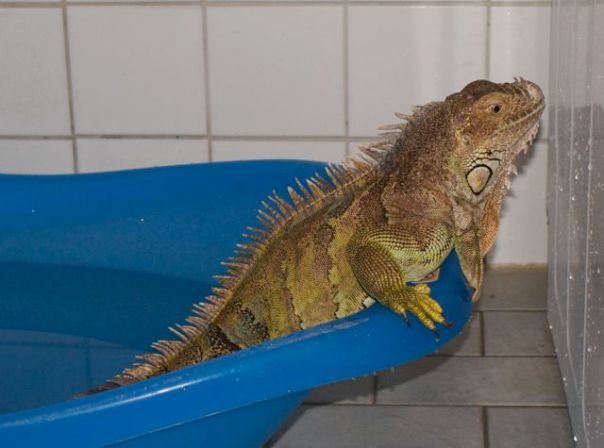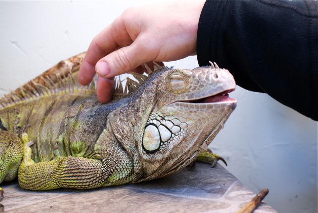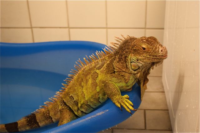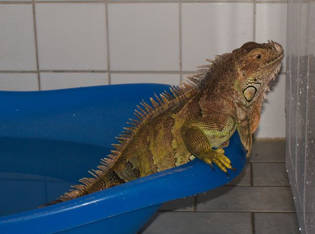 Leguaner är också ganska känsliga djur, som kräver rätt mat, rätt luftfuktighet och rätt temperatur för att må bra. Eftersom de är gjorda för att bo i regnskogen får de lätt hälsoproblem här uppe i norr. Det har varit ett antal veterinärbesök sedan vi tog över henne. (Tur att vi har henne försäkrad!) Hon har haft problem med att ömsa skinnet på svansen så hon blev tvungen att amputera svansspetsen och hon har två gånger fått opereras för att ta ut ägg som hon inte kunnat lägga. (Det är svårt att hitta en bra, fuktig sandbank i vår lägenhet. Vi försökte bygga en äggläggningslåda, men den struntade hon högaktningsfullt i.) Första gången steriliserades hon, men hon återbildade sina äggstockar under året som följde och fick ändå ägg som hon inte kunde lägga eftersom hon inte hade några äggledare kvar! Det är tydligen väldigt ovanligt, men enligt veterinären så är det ett tecken på att hon trivs hos oss – alltid något… Nu håller vi tummarna för att hon inte återbildar dem igen!