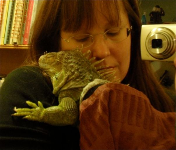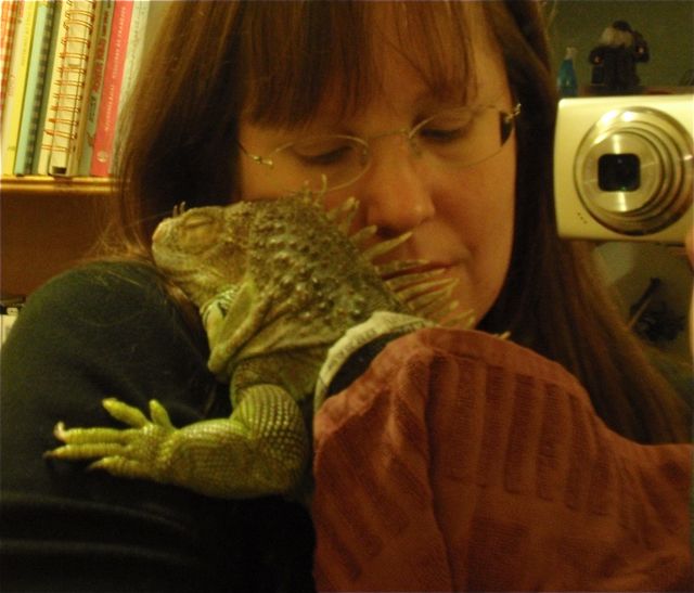 F ö kanske det är dags att påpeka (innan alla läsare rusar åstad och köper leguan) att Katla uppenbarligen är en osedvanligt tam och kelig leguan. Vår veterinär har varit lite förbluffad över hur snällt hon låter sig hanteras och hur tillgiven hon är. Många leguaner blir aldrig lika tama som hon, och det krävs mycket arbete för att socialisera dem. Vi tog över henne som vuxen från min sambos kusin, och de tog ut henne tre gånger om dagen när hon var liten fast hon protesterade och bets och inte alls uppskattade det då. Nu är hon ju en distingerad gammal dam på 10 år, så hon är lite lugnare nu. I en leguanbok jag har står det att man ska räkna med att det tar runt ett år att få en leguan tam. Vi har haft en otrolig tur som fått en så underbar liten ödla!