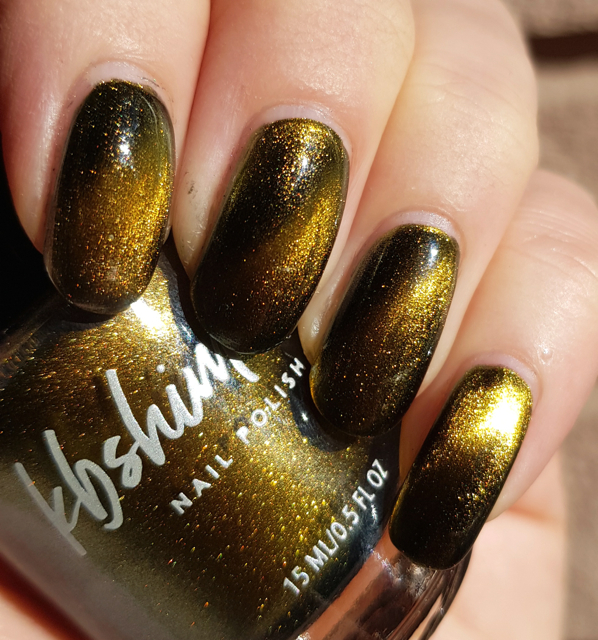 Magnetiska, multikromatiska lack är nog något av det finaste som går att hitta i lackväg. Det är lite magiskt hur färgerna rör sig över naglarna. Jag försöker att inte köpa så många nya lack numera (jag har ju så jag klarar mig några livstider), men magnetiska multikromer behöver jag fortfarande fler av! KB Shimmer Thrust Issues köpte jag rätt nyligen från Hypnotic Polish, och det är riktigt, riktigt vackert. Det skiftar mellan guld, orange och grönt över en svart bas och har ett härligt djup.