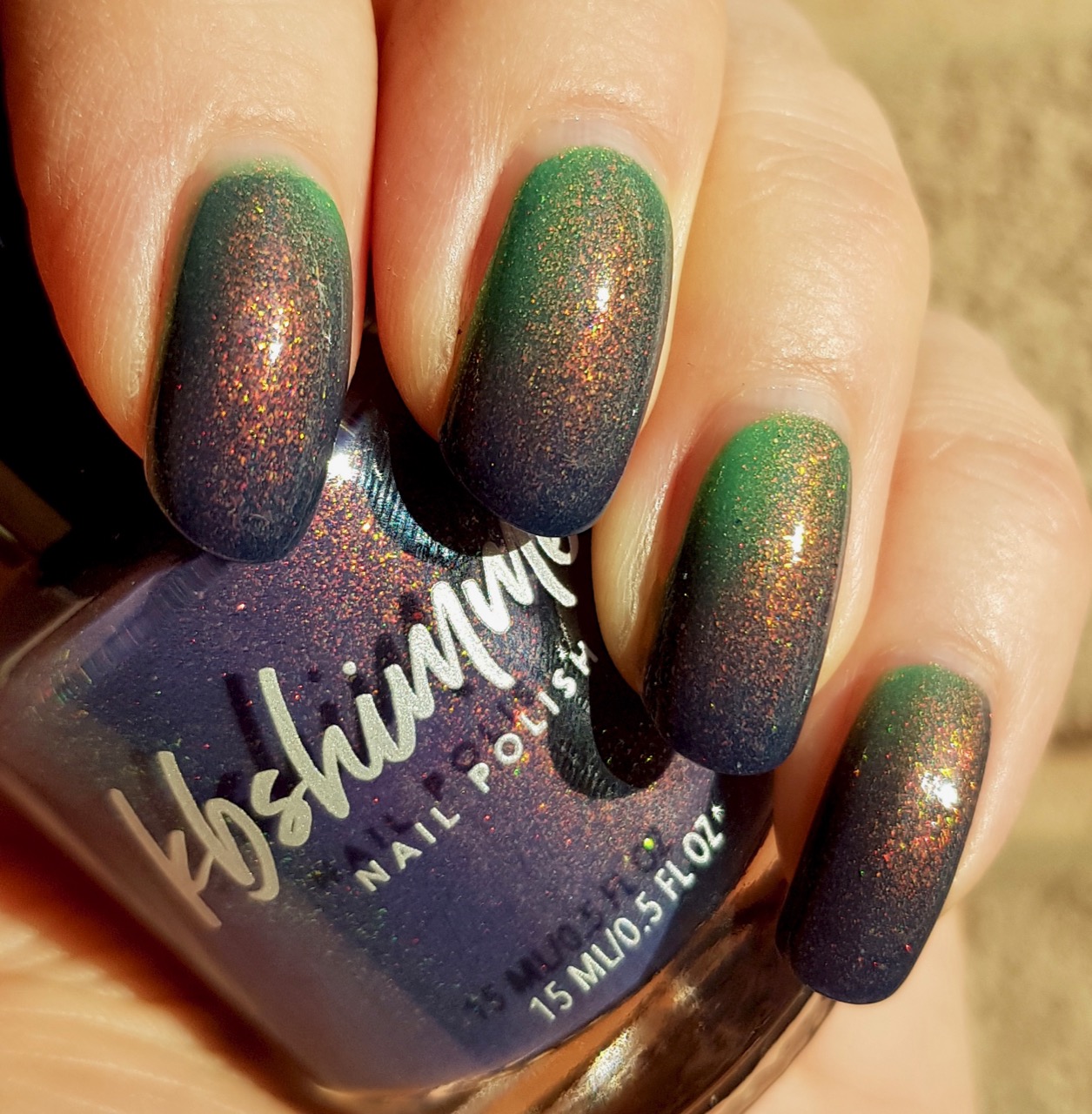 In English: KB Shimmer Best Buds is a tri-thermal that shifts from a dark bluish purple when it’s cold through a reddish purple to a bright green when warm. It also has a very nice orange to green duochrome shimmer. I really like it! The shifts are very visible, and now that it has been quite cold at home, I have had the delight of watching it in all its shapes depending on my body temperature.