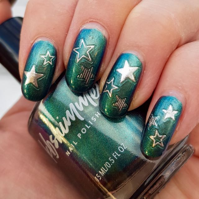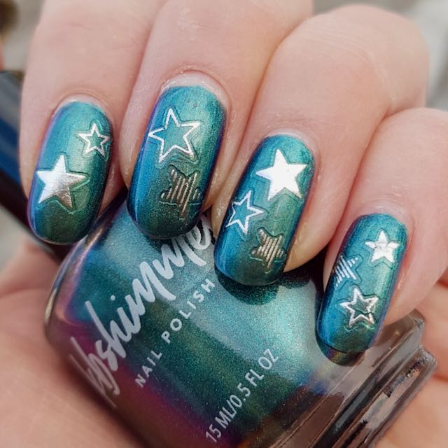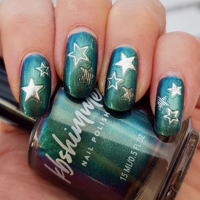 Den här manikyren bar jag innan jul, men den känns ganska passande till nyår också. KB Shimmer Stay Salty är ett multikromatiskt lack som skiftar i ganska kalla toner av grönt, blått och lila. Lite ovanligt i färgskalan, men väldigt fint. Dekalerna är från So Nailicious.