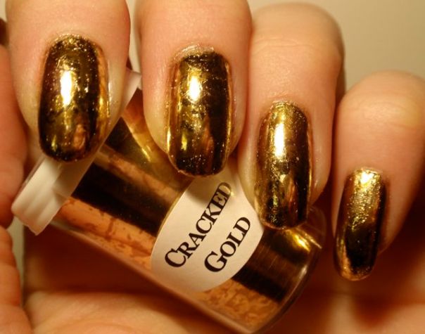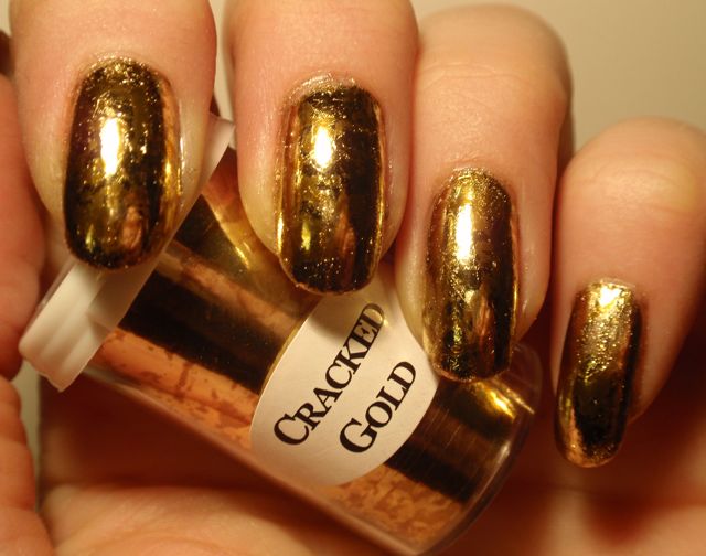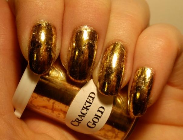 Jag har nyss fått hem några nya nagelfolier från No 1 Nail Art Shop på eBay, däribland den här lite spräckliga guldfolien. Som basfärg hade jag tre-fyra lager Kicks Brownish Bazar (det var väldigt skirt, men annars bra att lacka med), som färgmässigt matchade de mörkare partierna av folien perfekt. Det är alltid bra att ha en matchande lack under så det inte märks så mycket om inte folien fäster överallt. Folien var väldigt trevlig att jobba med, vilket faktiskt gäller för alla folier jag har köpt från No 1 Nail Art Shop. Det blev också seriöst blingigt, verkligen som att ha riktigt guld på naglarna! Att ha Seche Vite direkt på folie brukar vara en dålig ide eftersom det lätt skrynklar ihop den. Den här gången hade jag istället ett överlack från Konad, som är bra eftersom det dessutom inte smetar ut färgen i folien. Det torkade faktiskt rätt fort, så jag hade inget annat överlack första dygnet, men tyvärr skyddade det sämre än Seche och folien blev ganska sliten fort.