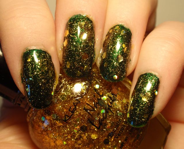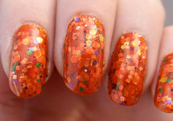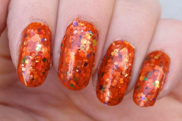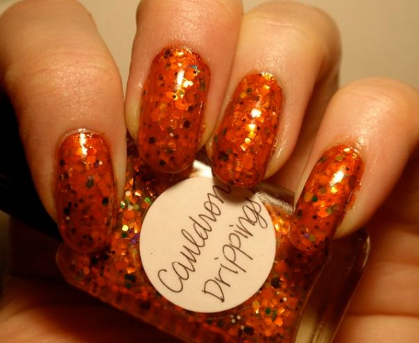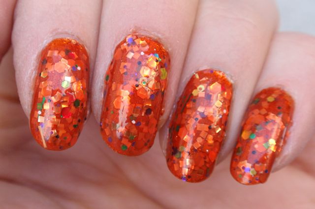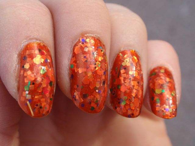 Hur som, lacket har en rätt svagt orange bas, packad med glitter i alla tänkbara färger och former, men med en övervikt åt orange. Det är nog svårt att få det att täcka på egen hand (jag försökte inte ens), så jag lade två lager Cauldron Drippings över ett lager Kleancolor Metallic Orange. Det funkade bra, eftersom Metallic Orange är rätt lik Cauldron Drippings i grundtonen. Det var ju givetvis inte helt lätt att lacka med, men inte värre än man kan förvänta sig när det är så sjukt mycket glitter i ett lack. Det tog ett antal lager överlack för att få det hyggligt jämnt också. Men som det glittrar! Det är ett lack man blir glad av att ha på fingrarna! (Fast man blir inte glad av att ta bort det… jag säger bara glitter överallt! ;-))