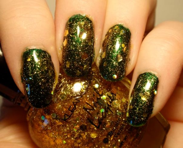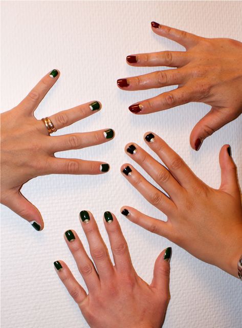 Lacken är GOSH Gold, China Glaze Snow, Rescue Beauty Lounge Recycle, China Glaze City Siren och A-England Lancelot. Det var kul att se hur många snygga kombinationer man kunde få till (ovanifrån och ner är det rött/guld, grönt/vitt, svart/guld och grönt/guld). Det är ju rätt enkelt att få till det när man kan maska av med de där små runda fnuttlarna, så de flesta fixade det på egen hand. Kul att få sprida lite nageldekorsentusiasm!