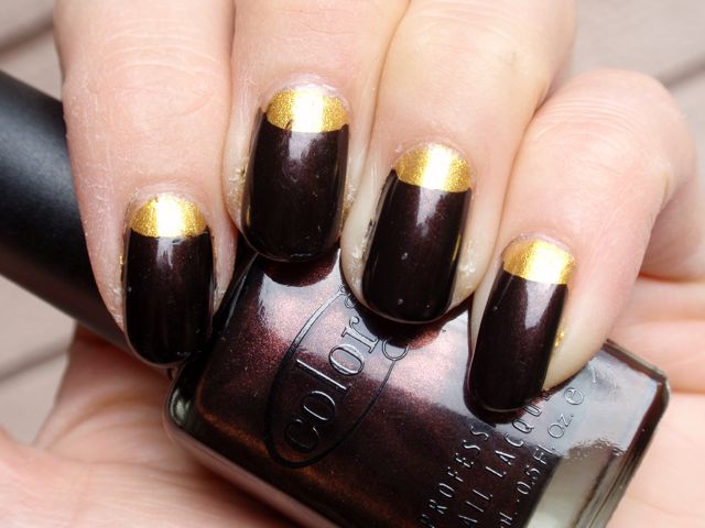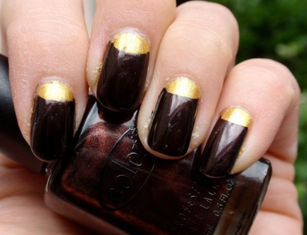 I lördags hade vi möhippa för en av mina vänner (det var det jag hade lite att göra med som jag skrev om tidigare, men jag kunde ju inte specificera vad i fall hon skulle läsa det) och då blev det lite naglar målade. En hel liten manikyrworkshop nästan, det var riktigt kul! Vi hade 20-talstema till middagen, inklusive en charlestonlektion. (Det var galet jobbigt, flapperflickorna måste haft väldigt god kondis för att kunna studsa runt på det sättet en hel kväll!) Mina naglar hade jag grundat med två lager Kleancolor Metallic Yellow kvällen innan och gjorde en halvmånemanikyr med Color Club Nothing But Truffle innan middagen. Jag använde såna där små plastringar som man förstärker hål på papper innan man sätter dem i pärmar med för att maska av. Mycket smidigt (och inte min ide, jag har sett det någonstans på nätet). Jag forskade lite på nätet innan möhippan och såg att man på 20-talet oftast målade bara den mittersta delen av nageln och lämnade spetsen och halvmånen bar (den här sidan var intressant att läsa t ex). Det kändes lite för pyssligt att försöka lämna spetsen bar också, och så ville jag matcha min klänning, så jag körde guld och brunt istället.