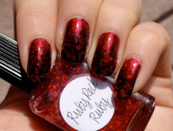 Det här är manikyren jag hade på gårdagens bröllop. Jag hade en fascinator i svart och rött i håret, så jag matchade med naglar i samma färger. Jag började med ett lager Kleancolor Metallic Red, som har en riktigt trevlig formula och som faktiskt täcker på ett lager. Därefter svampade jag tipparna med A-England Camelot och la på lite Lynnderella Ruby Red Ruby på det för lite extra bling. Jag är rätt nöjd med resultatet, det blev trevligt djuprött, men med lite gnister av glittret.