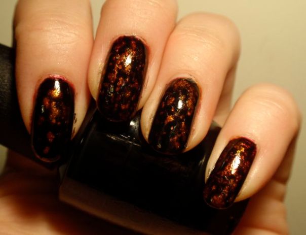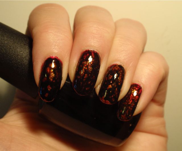 Jag ville få lite känsla av flytande lava, så jag svampade ihop en basfärg i röda och orangea toner med Kleancolor Metallic Red, Metallic Orange och Metallic Yellow. För att få lite gnister svampade jag också på lite av det orangea glitterlacket China Glaze Dreamsicle. Det blev lite för rörigt för att vara snyggt på egen hand, men blev rätt bra som bas under Black Spotted.