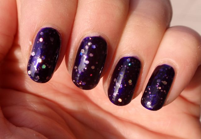 This polish was very tricky to photograph, and looks much better IRL than in my pictures. It is a lovely dark purple with lots of gold holo glitter. It really sparkles like mad in the sun.