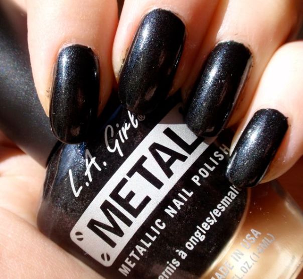 Det här var det första av L.A. Girl Metal-lacken som jag inte blev överdrivet förtjust i. Det ser himla fint ut i flaskan, men det blev inte så speciellt på nageln. Glittret kommer inte riktigt fram ordentligt och det blir mest som ett lite gråtonat svart lack. Inget fel med det, men jag hade hoppats på mer bling. Dessutom var det lite mjukt, även under Seche Vite, och blev lite smårepigt väldigt fort. Applikationen var bra, det täckte fint på två lager, men hållbarheten var faktiskt inget vidare. De andra lacken har jag lugnt kunnat ha i fem dagar utan att det knappt synts någon tipwear, men det här hade ganska rejäl tipwear redan efter ett dygn.