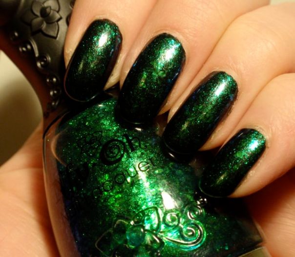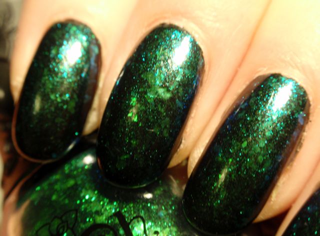 Allt sammantaget gjorde att jag efter bara ett dygn ledsnade på det och la på ett lager Nfu Oh 56, ett underbart grönt flakelack. Det är riktigt tjusigt, och särskilt när det är lite vårsol ute så det får glittra loss. Det har en duokrom effekt i blått också, som inte direkt gör det fulare. Jag älskar verkligen djupet i Nfu Ohs flakelack, det känns som att man har ädelstenar på fingrarna!