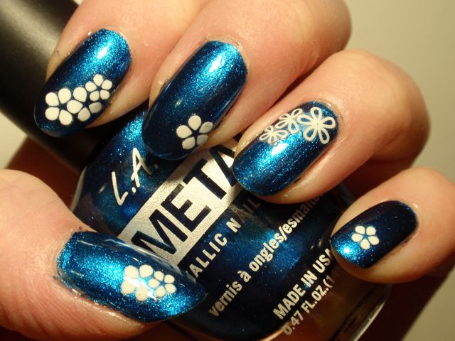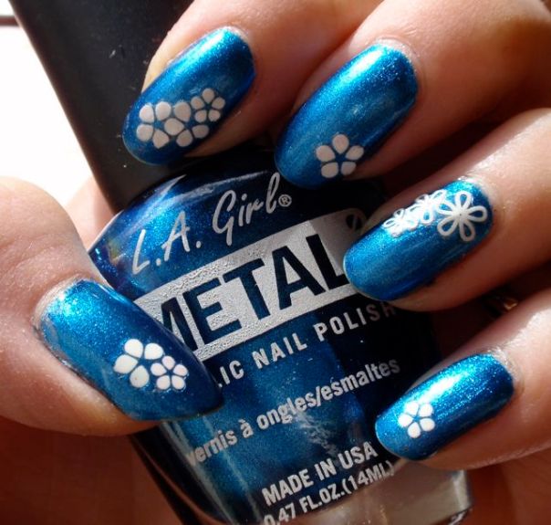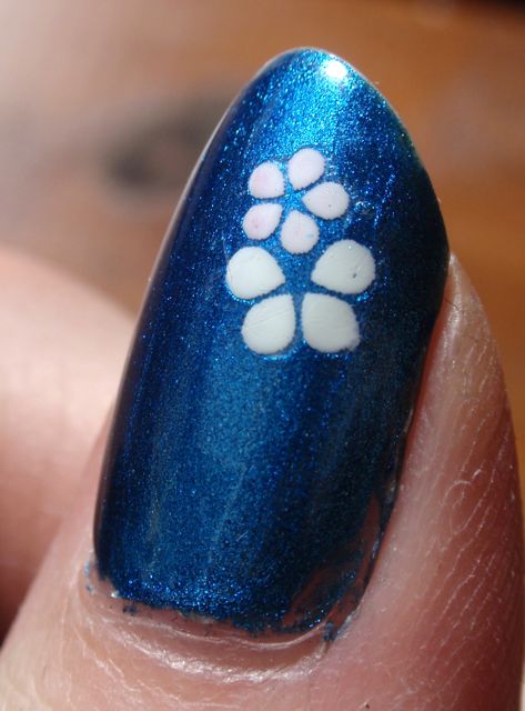 The sponging was done with L.A. Girl Metal Sterling Silver and the black petals were painted with a nail art-polish. I finished by adding a pink rhinestone.