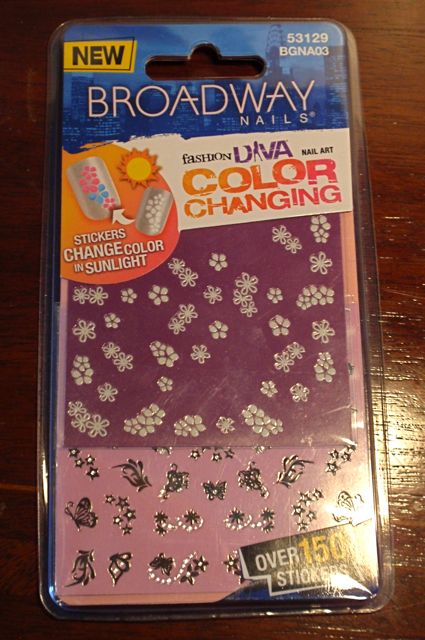 Hur som helst, jag passade på att testa några klistermärken från Broadway Nails som ska skifta färg i solljus. Jag har köpt dem på Åhléns för 50 kr. Ganska fina klistermärken, men tyvärr är de lite för styva, så om de inte fastnade perfekt gick gärna kanterna av klistermärkena av efter ett tag. Inomhus ser de ut så här: