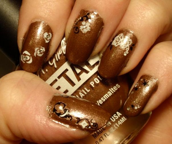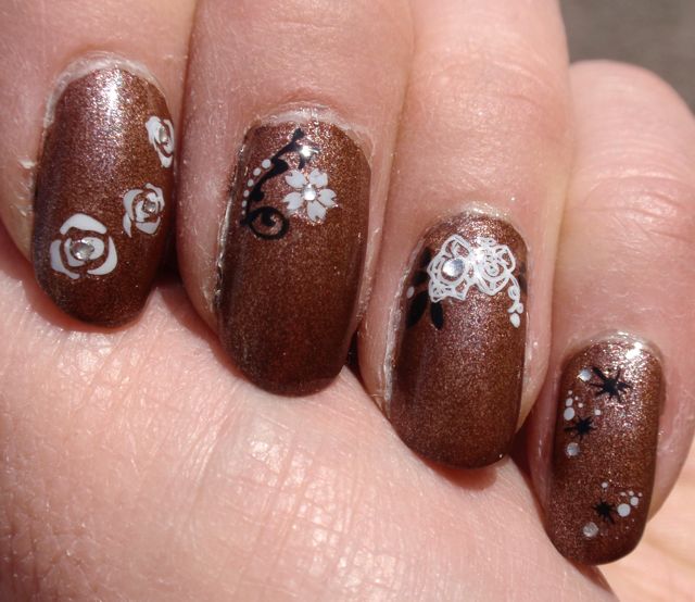 Well, this did not turn out too good… I don’t know if there was a problem with my bottle, but Bronze Medal was super sheer. It took five coats to get it relatively opaque. I did not have the patience to wait for it to dry properly before I applied the water decals, so it never dried (the decals covered the whole nail), and got sadly dented. It was not as obvious from a distance, but it really shows in the pictures. It is a pity since I liked the combination of polish and decoration.