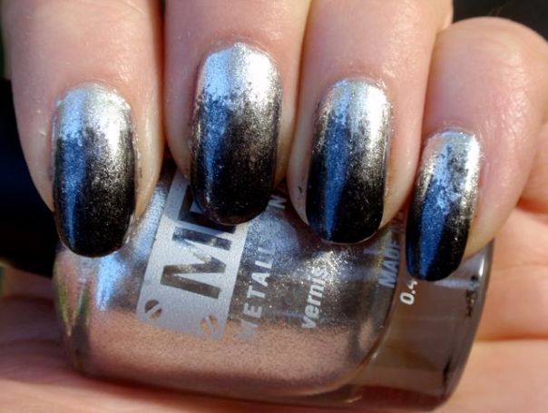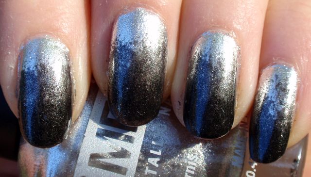 Det här är mitt första försök att svampa, och det var lättare än jag trodde, faktiskt. Jag har blivit imponerad av Lillasysters snygga svampade manikyrer och det var väl helt enkelt dags att pröva själv. (Lillasyster har en tutorial för hur man gör här, ifall någon undrar.) Jag blev lite inspirerad när jag såg tre av mina L.A. Girl Metal-lack stå bredvid varandra på min hylla med oprövade lack och noterade hur bra de gick in i varandra. Så det blev en svampad gradient i svart och silver. Jag började med två lager Sterling Silver, svampade sedan på ett lager Graphite på de yttersta två tredjedelarna av nageln och avslutade med ett svampat lager Obsidian på den yttre tredjedelen. De passade riktigt fint ihop och det var som sagt lättare än jag trodde att svampa. Den här manikyren blev jag riktigt nöjd med, faktiskt!