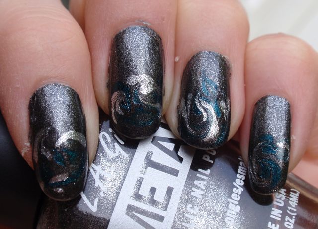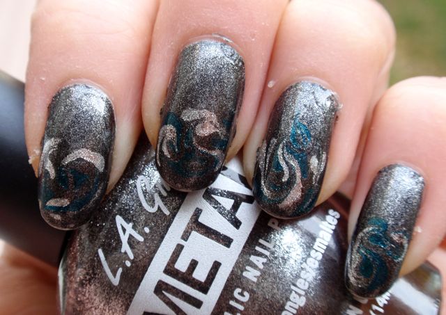 Lite tidsbrist p g a sömnad av brudklänning har gjort att det har blivit ganska snabba manikyrer på sistone och dragmarmorering är en bra variant när man har knappt om tid. Den här gången använde jag tre L.A. Girl Metal-lack, stålgråa Graphite som basfärg med marmorering av ljust silvriga Sterling Silver och grönblåa Deep Sea Mica. Jag hade två lager Graphite först och använde en dotting tool för att pricka ut Sterling Silver och Deep Sea Mica på yttersta halvan av nageln och drog sedan runt i det med en tandpetare. Snabbt och enkelt. Blev rätt bra resultat också, tycker jag nog, och det hade bra hållbarhet.