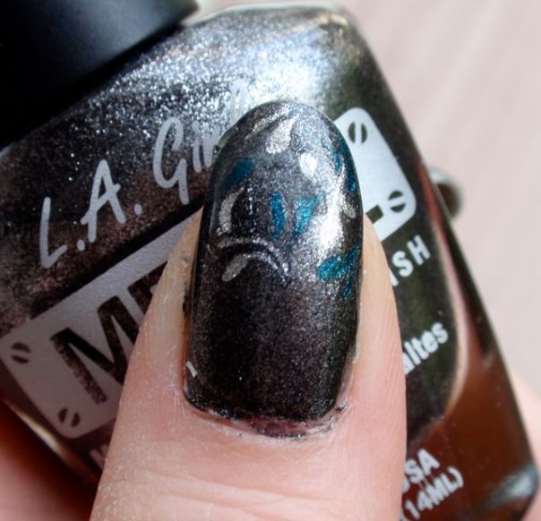 Dekoren är jag inte helt nöjd med. Jag blev inspirerad av en tutorial på YouTube (ni kan se den här) från en kanal full med ursnygga manikyrer. Tyvärr har jag dels inte så bra verktyg och dels för ostadiga händer, så det blev lite klumpigt gjort. Det duger, men inte mer. Jag borde se till att skaffa mig akrylfärger och smala penslar så det går att göra lite snyggare dekorer… Svampningen i botten är i alla fall gjort med L.A. Girl Metal Sterling Silver och de svarta blombladen har jag målat med ett nail art-lack. Och så petade jag dit en liten rosa strassten i hörnet också.