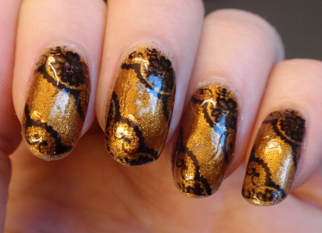 Hm, det här blev ju inte så bra, faktiskt. Jag vet inte om det var något fel på min flaska Bronze Medal, men det var superskirt. Jag fick lacka fem lager innan det var hyggligt täckande. Udda, med tanke på att jag inte haft det problemet med något annat Metal-lack. Hur som helst hade jag sedan inte tålamod nog att låta det torka ordentligt innan jag satte på heltäckande vattendekaler, vilket resulterade i att eländet aldrig torkade ordentligt och blev ganska buckligt och sorgligt att se på. Det såg ok ut på håll, men på bilderna syns det tyvärr alltför väl. Synd, för jag gillar annars kombinationen av lack och dekor.