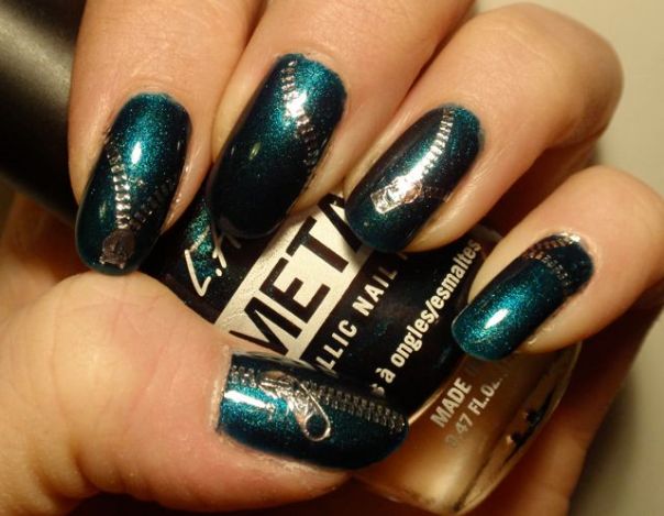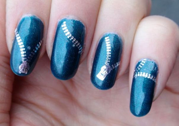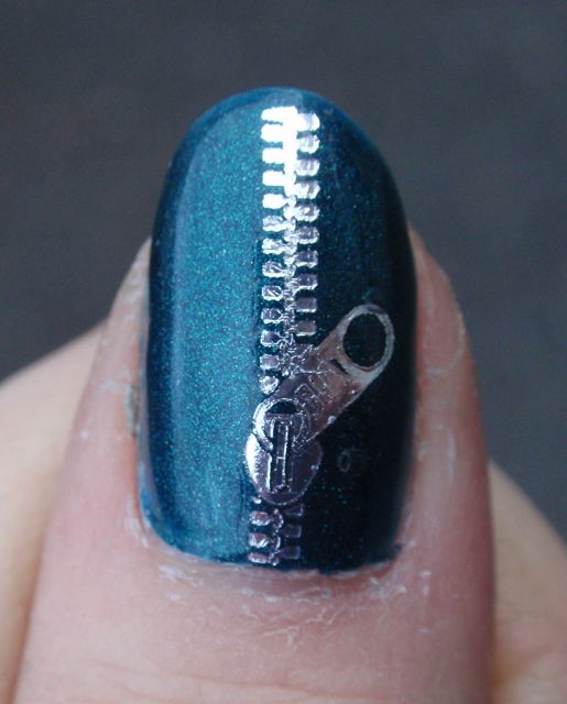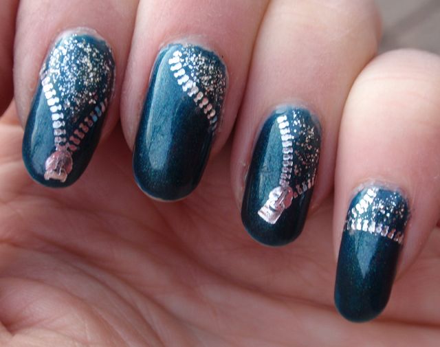 Efter ett par dygn insåg jag att jag ju faktiskt borde utnyttja att dekalerna föreställer dragkedjor, så jag petade på lite glitterlack så att det ser ut som att det ligger ett glittrigt tyg under.