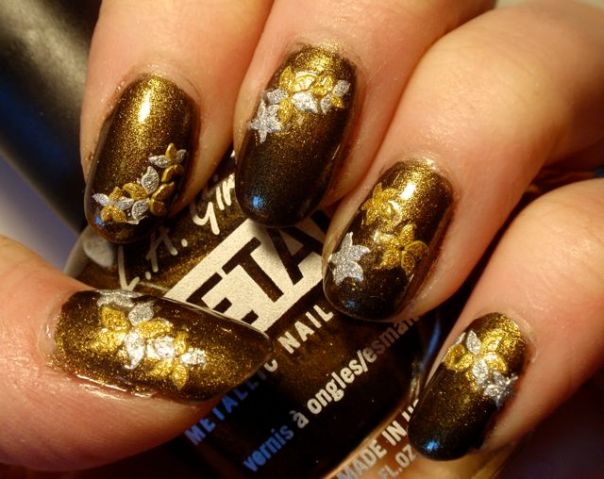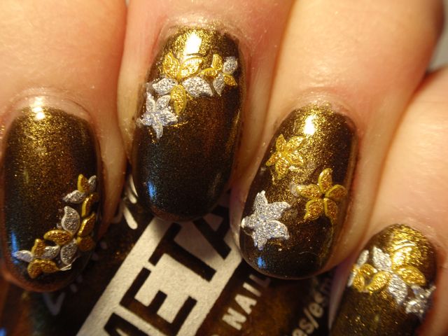 Antique gold är egentligen huvudsakligen grönt i tonen, men det ser brunguldigt ut i vissa ljus (t ex när jag skulle fota det). Härligt metalliskt skimmer. Klistermärkena är från eBay och väldigt bra, tunna och fina, fäster bra och går inte sönder för lätt. Tyvärr kommer jag inte ihåg vem jag har köpt dem av.