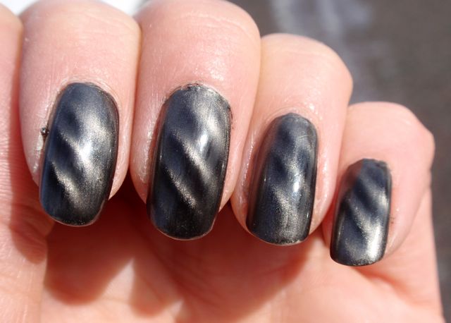 Det har kommit ett gäng kollektioner med magnetiska lack på sistone, och jag har varit lite nyfiken på att testa dem, så när Nailmail hade dem som månadens lack köpte jag på mig tre av dem. Det första jag testade var det mörkgråa, Iron Magic. Nu får ni ha överseende med att det här är mitt första försök med magnetiska lack, så det blev rätt långt från perfekt (och då var högerhanden ännu värre, men den får ni inte se… ;-). Jag har två lager på en del naglar och tre på andra eftersom jag inte lyckades på första försöket på alla fingrar, direkt. Fördelen är att det är lätt att bara lägga på ett till lager och göra om, det kan rädda en del i alla fall. Sedan har jag också lite för kupiga naglar egentligen, det går inte riktigt att få mönstret över hela nageln eftersom avståndet till magneten blir för långt. Men trots allt tycker jag det är ett snyggt lack och en rolig effekt, så jag kommer säkert testa igen!