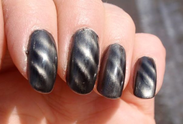Det där med magnetiska lack känns väl lite som en gammal trend vid det här laget, men det här har stått otestat länge så det var dags att hugga in på det. Mina naglar passar inte för magnetiska lack, så jag har inte varit så sugen. De är väldigt kupiga, vilket resulterar i att det bara blir mönster mitt på nageln eftersom magneten inte är stark nog att ge effekt på resten. Inte så skojigt. Ni kan se hur det blir här.