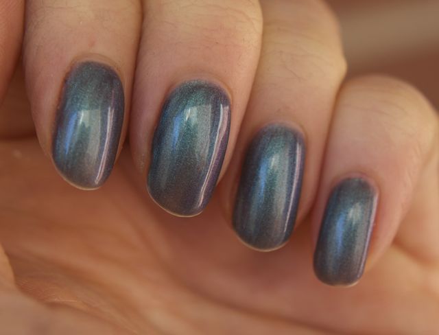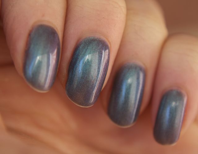 Blue Magic, som jag hade, är det mörkare av de två duokroma lacken. Det är ett gråtonat blått som skiftar i lila. Riktigt fint, och ganska milt i färgen. Tycker jag i alla fall. Jag fick kommentarer på releasefesten om att jag var modig som vågade ha så mycket färg. Hmmm… De skulle se vad jag knallar omkring med på naglarna annars! 🙂