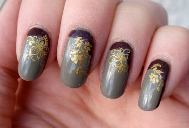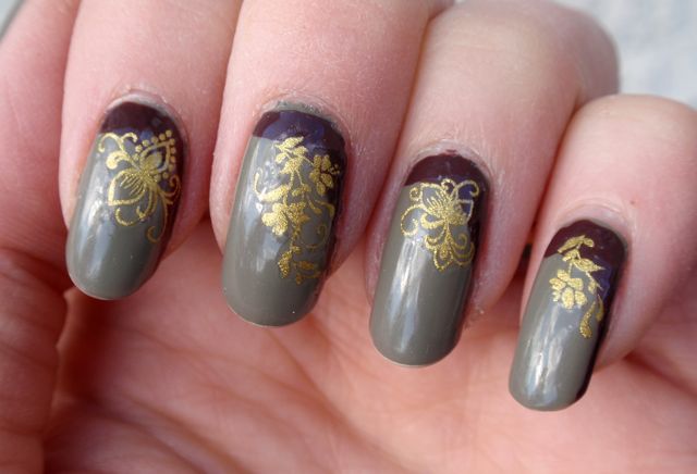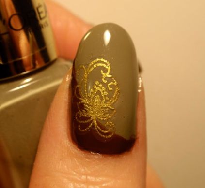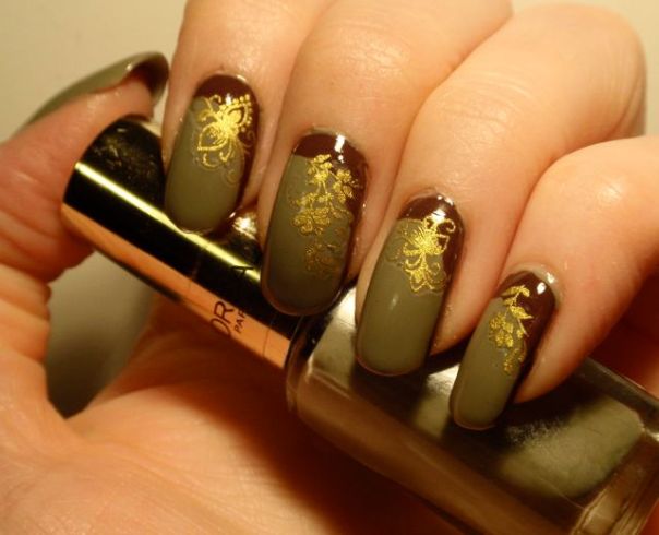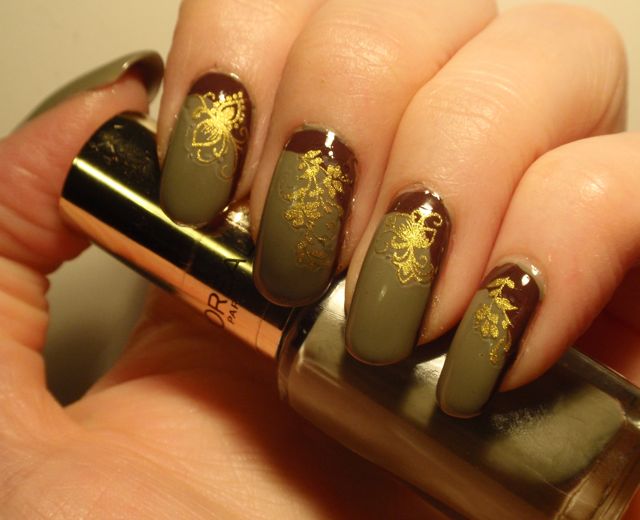 Dekoren är en sorts sned ruffian i brunt målad med ett brunt nail artlack från Jessica. Över det satte jag klistermärken i guld från Kiss som jag har köpt på Åhlens eller Kicks (kommer inte ihåg, de finns nog på båda ställena). Mycket trevliga klistermärken, mjuka och fina utan att vara sköra. Tycker det blev rätt stilrent och är ganska nöjd med resultatet.
