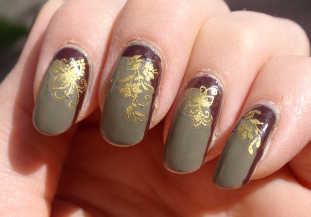 The base is my new favourite black creme, Noir Noir from L’Oreal Paris. It is easy to apply and covered in just one coat. Over that I added one coat of Healing Peony, and as you can see, the glitter is quite dense. You can see the pink in it if you look carefully, but it mostly looks antique gold. Very nice! It was a bit thick to apply and not entirely easy to get even.