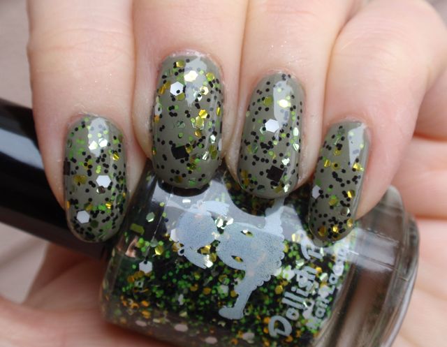 Jag börjar egentligen bli lite trött på knasiga glitterlack, men det här kunde jag inte motstå. Det är en udda kombination av medelstora vita hexglitter, svarta fyrkantiga glitter, små hexglitter i guld och grönt (chartreuse är det nog faktiskt) och pyttiga glitter i svart och grönt. Det blir liksom rörigt, dämpat och glittrigt på samma gång… Som bas använda jag två lager av L’Oreal Color Riche Rive Gauche Green (nr 605) som jag har skrivit om tidigare här. Det kändes rätt givet att ha ett militärgrönt lack som bas till ett glitter på kamouflagetema…