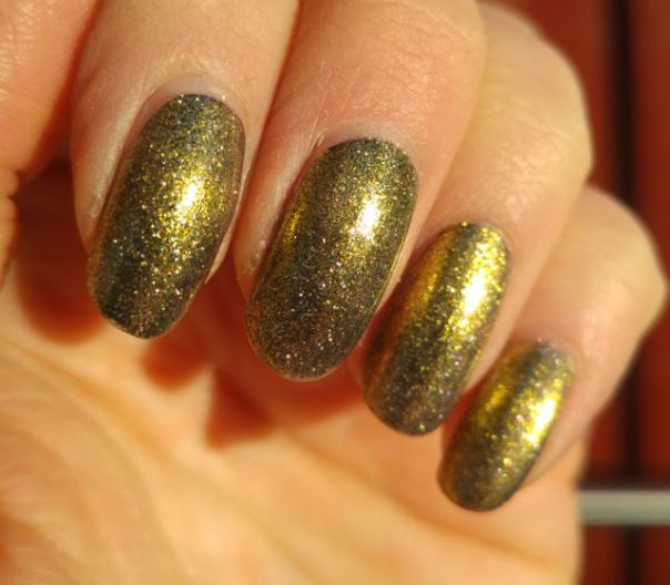 Som bas använde jag min nya favorit bland svarta krämlack, Noir Noir från L’Oreal Paris. Det är ett riktigt bra svart krämlack som var lätt att applicera och täckte på endast ett lager. Över det la jag ett lager Healing Peony, och som ni ser är det tätt med glitter i det. Man kan ana att det är rosa i det, men det ser huvudsakligen antikguldigt ut. Mycket snyggt! Det var lite tjockt att applicera, dock, och inte helt lätt att få jämnt.
