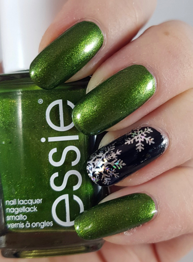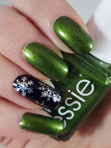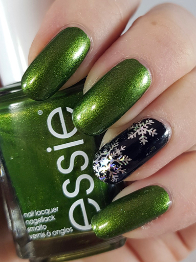 In English: It was a long time since I last used nail art foils, but a bit before Christmas, I did remember that I have some nice snow flake foils and did a foil accent nail. I painted the other nails with Essie Sweater Weather from their autumn collection. Lovely green shimmer! Two coats was enough and it applied perfectly.