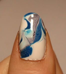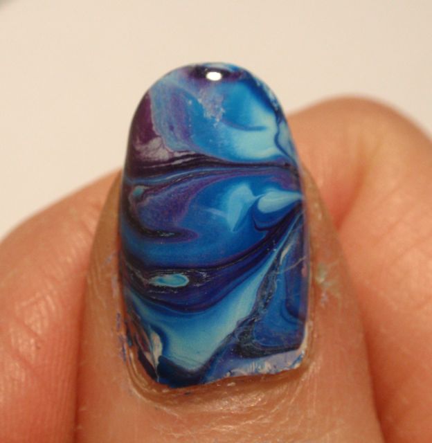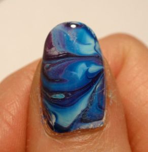 Nu har jag till slut vågat mig på att testa vattenmarmorering, och även om det inte blev ens i närheten av så snyggt som när de riktigt proffsiga gör det, sä är jag rätt nöjd! (Jag kan rekommendera bloggen My Simple Little Pleasures om ni vill se hur snyggt det kan bli när någon gör det som vet vad hon håller på med.) Det blev lite småkladdigt och så, men rätt roligt! Jag kommer säkert att försöka igen. Jag använde marmoreringsfärger jag har köpt på Trans Design (där finns också bra instruktioner) och en ”Masking jelly” som jag köpte på samma ställe. Den sista är en gel som man lägger på huden runt om nageln så inte hela fingertoppen ska bli marmorerad, och den var verkligen bra att ha – även om jag allt blev rätt kladdig om fingrarna och det krävdes en del städning innan tassarna var anständigt rena. Jag hade lite problem med tekniken, färgen spred sig inte så snyggt på vattnet som på de filmer jag har sett, och dessutom hade den en tendens att torka innan jag hann göra några snygga mönster. Mer övning är av nöden. Nästa gång ska jag nog också prova att norpa lite avjonat vatten på jobbet att använda istället för kranvatten. Colette, som har My Simple Little Pleasures, använder filtrerat vatten, så det kanske funkar bättre med avjonat, vad vet jag.