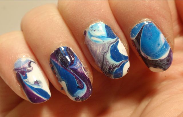 Det här är mitt första försök med marmorering, och det var faktiskt inte så svårt som jag trodde. Det blev ju inte direkt perfekt, och jag behöver öva en hel del, men det blev allt lite roligt. Jag använde Rescue Beauty Lounge Dead Calm, ett riktigt fint mörkblått lack. Det täckte väldigt bra, vilket jag misstänker är en förutsättning när man marmorerar eftersom man bara lackar ett tjockt lager som måste täcka. Sedan droppar man i ett annat lack och rör runt i det med en orangepinne eller tandpetare. Jag använde ett guldglittrigt nail art lack från Color Club att marmorera med. Instruktioner för hur man marmorerar hittade jag på My Simple Little Pleasures.