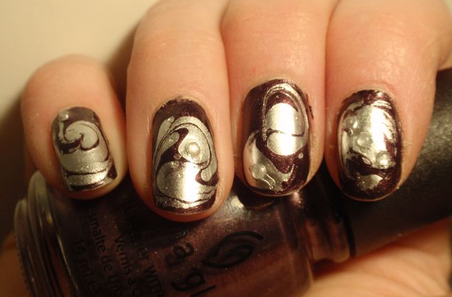 Nästa försök att marmorera. I det här använde jag China Glaze Bogie som grund och marmorerade med China Glaze Millennium, vilket inte var en bra ide. Millennium är ju ett kromlack och torkar jättefort, vilket gjorde att det var väldigt svårt att dra runt i Bogie. Det blev liksom en torr klick i det våta baslacket. Inte så bra. Det blev ok ändå, men inte som jag hade tänkt. Jag klämde också dit lite strasstenar för att pigga upp det en aning. Det är lite kul med marmorering i alla fall. Det går himla fort att göra och blir ändå rätt fint.