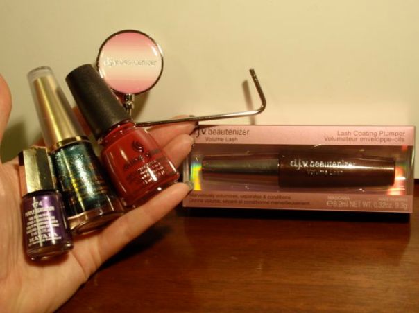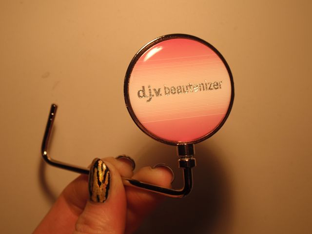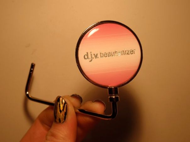 Mascaran är d j v beautenizer Volume Lash. Ska bli kul att testa. Jag kommer nog inte recensera den eftersom jag aldrig har fotat smink, däremot. Jag fick med en extremt mysko pryl också. Det är som en liten vridbar bricka med d j v beautenizer-logga på som sitter på en böjd pinne. Kan det vara en portabel krok? Någon som har en ide?