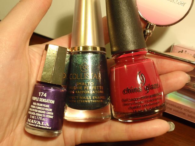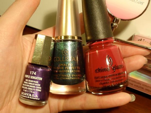 Lacken jag fick är China Glaze City Siren, Mavala Purple Sensation och Collistar Verde Lamé Mat. Collistarlacket är det som ser klart roligast ut. Det är ett blågrönglittrigt matt lack som inte liknar något annat i min samling. Det ser riktigt fint ut! Mavalalacket är en fin lila, men inte unik. Jag har ingen dupe, däremot, så det kan säkert komma till användning. China Glaze-lacket ser ut som ett klassiskt rött krämlack. Det är lite kul, det är nästan exakt likadant som det enda andra lacket jag någonsin fått gratis, Picture Polish Rouge. Lustigt sammanträffande…