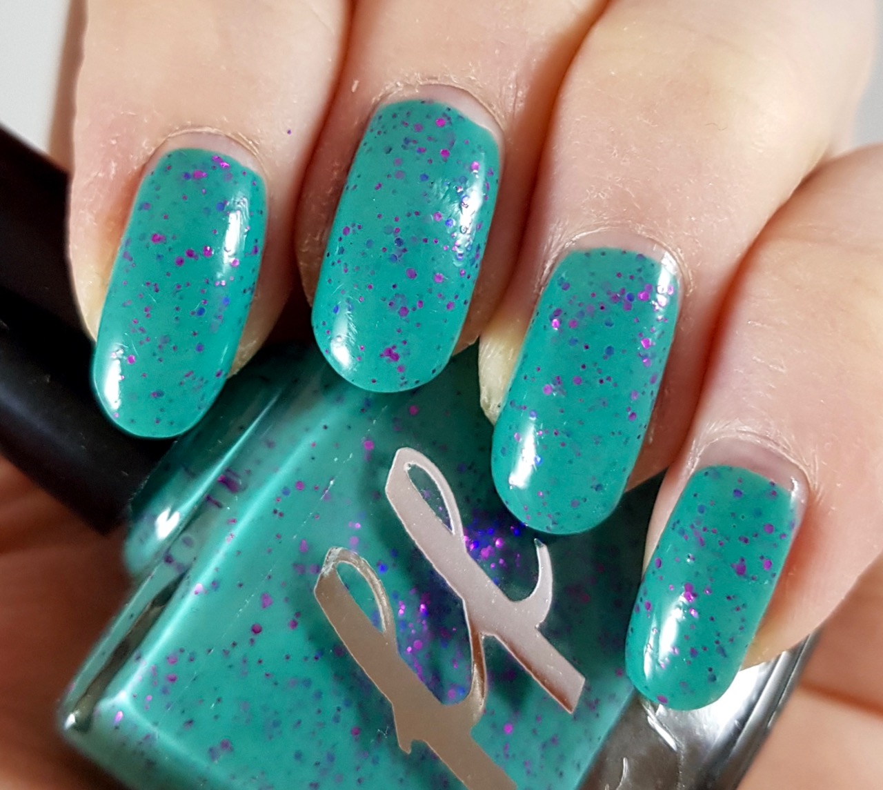 One of the polishes were Femme Fatale Frozen Fudge, from the May Hella Handmade Creations. It is a bright turquoise with small purple glitter. Delightfully colourful, and just what I needed to cheer me up at this time of the year! Some might say that it is a summer polish, but I would gladly wear this all year round.