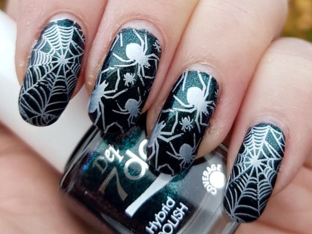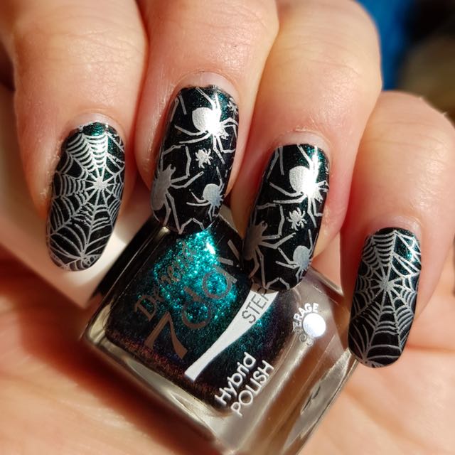 Since it is Halloween, I of course stamped some spiders on it as well using Hit the Bottle Moonshine, a nice silvery white stamping polsh, and the Lina Spookilicious 01 plate.
