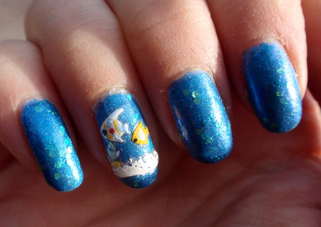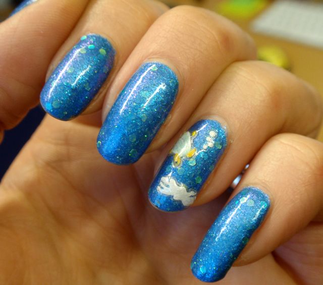 Den här manikyren är inspirerad av en manikyr jag nyligen såg hos More Nail Polish. Jag tyckte den såg väldigt cool ut på hennes bilder, men är inte alls lika förtjust i min version. Delvis beror det på att min är slarvigare gjord, men det är nog också så att det är en sån där manikyr som är snyggare på bild än i verkligheten. Eller så är den bara lite för ljusblå för mig… 😉
