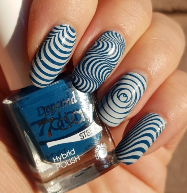 Tyvärr hade mitt överlack blivit lite tjockt och bubblade på två fingrar innan jag bytte till en fräschare flaska, så jag kände ett visst behov av att dölja bubblorna. Lösningen blev att stämpla över med Depends vita stämplingslack och motiv från ÜberChic Beautys OP Art Magic-platta. Det blev ganska coolt, om jag får säga det själv! Stämplingen blir fortfarande inte perfekt, men tillräckligt bra för att jag ska vara nöjd med det.