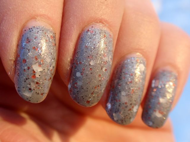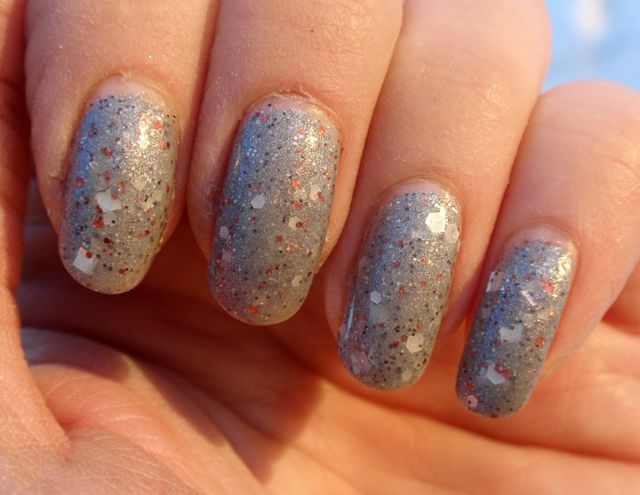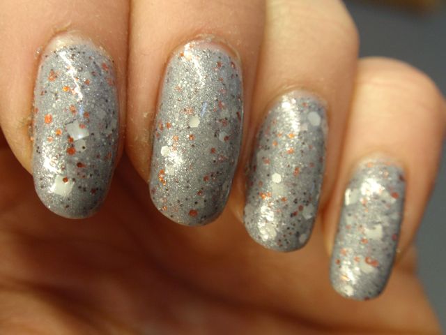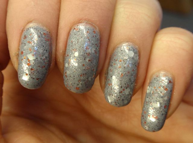 Det här lacket har jag suktat efter länge, men det var hela tiden slutsålt fram tills för några veckor sedan när jag beställde mina limited edition Picture Polish-lack från Llarowe. Mycket nöjt petade jag ner det här också i varukorgen och blev lite fattigare än jag hade räknat med! Men det var det värt, för det är till och med snyggare än jag trodde. Det har en mjuk mellangrå grundfärg med kopparfärgade och matta silverfärgade glitter. Några av glittren måste också vara prismatiska, för det gnistrar så vackert i solen! Två lager räckte för full täckning, det var lätt att måla med och torkade fort. Underbart fint lack, och sådär diskretblingigt som jag gillar!