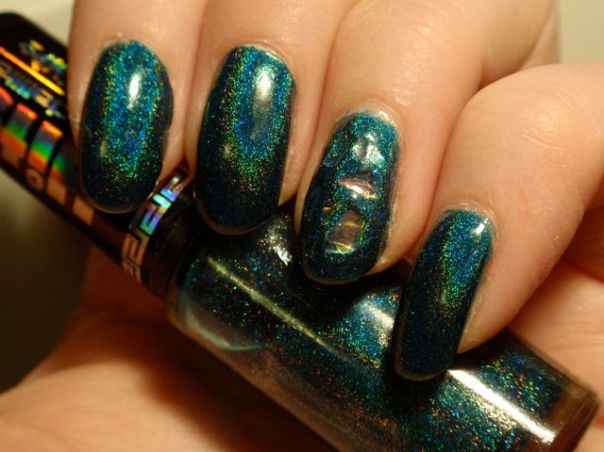 Hits Hera är i alla fall ett väldigt fint hololack! Det har riktigt maffiga regnbågar som även syns inomhus. Jag hade det för ett par månader sedan, så jag kommer inte ihåg hur det var att applicera, men i o m att det har gått åt en tredjedel av den – visserligen lilla – flaskan, så misstänker jag att det var ganska skirt. Jag har också ett vagt minne av att det var lite tjockt och besvärligt att måla med.