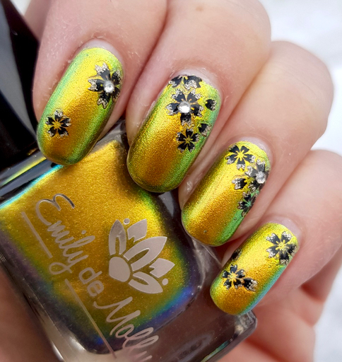 The base is Depend 652, a press sample from the Good Enough collection 2021. It is a light yellow creme that was opaque in three coats. I had to work a bit to get it even, but when I let it dry a while between the coats, it evened out on the third coat. Very nice and spring-y!