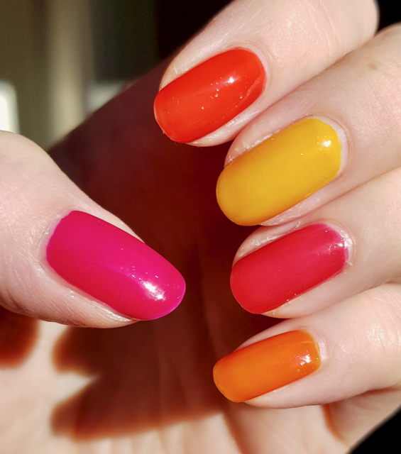 The polishes I used were (from thumb to pinkie): 6014 Cherry Secret, 6013 Bad Blood, 6015 Yellow Buzz, 6019 Red Rumor and 6016 Spicy Affair.