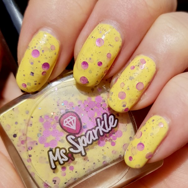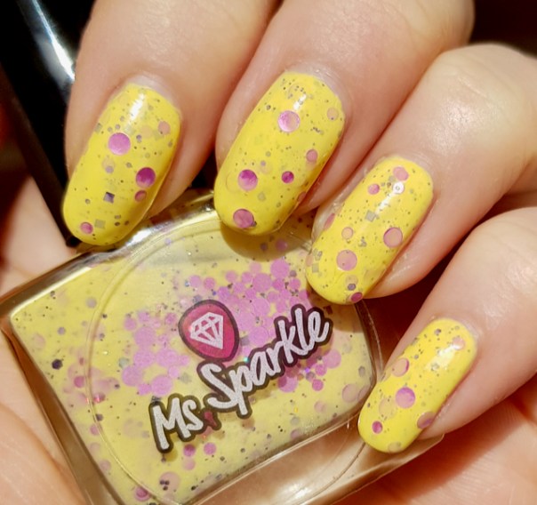 Ms Sparkle Meadowsweet är ljusgult med runda rosa glitter, mindre glitter i svart och lite hologlitter. Det var förvånansvärt bra att applicera. Det täckte på tre lager, hamnade där jag ville ha det, vallade sig inte och täckte riktigt bra för att vara gult. Jag behövde inte ens fiska efter glittren! Jag gillar det verkligen och det känns väldigt påskigt!