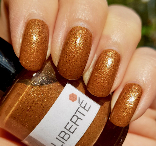 Det är lite trist att visa lack som inte går att få tag på längre, men jag använder bloggen lite som ett arkiv över mina lack, så jag slänger ut det här ändå. Nerdlacquer har ju tyvärr lagt ner, men hon gjorde ett gäng jättefina lack en gång i tiden. Liberté är inte lika speciellt, men det är riktigt fint. Basen är bronsfärgad och det är fullt med små guldglitter som gnistrar väldigt fint. Jag tror det kan vara lite små svarta glitter i det också. Jag tror jag hade tre lager och att det var lätt att måla med.